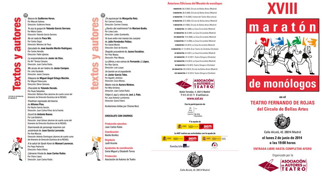 Organizado por la Asociación de Autores de Teatro, el próximo 2 de junio a las 19 horas se celebrará en el Teatro Fernando de Rojas del Círculo de Bellas Artes de Madrid, el XVIII Maratón de Monólogos Teatrales. Cita más que recomendable para conocer más y mejor el teatro de nuestros días interpretado por un brillante elenco de actores y actrices. Recomiendo no perdérselo.
