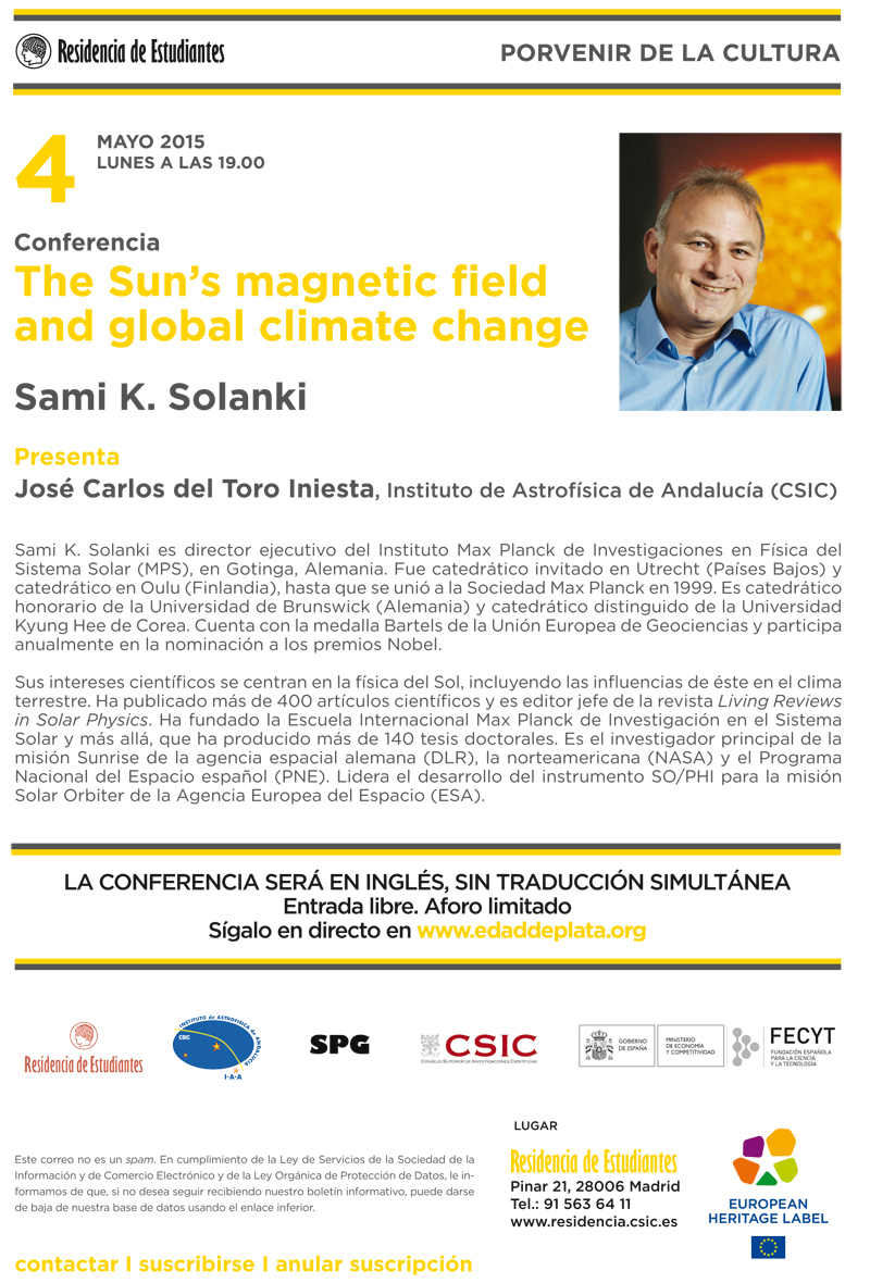 Suelo informar sobre las actividades en la Residencia de Estudiantes en Madrid, tanto por su calidad de contenidos como porque me parece un punto estratégico de la cultura. En esta ocasión, no dejo de hacerlo, pero con un regusto triste, porque una conferencia tan sugerente como la propuesta: The Sun´s Magnetic field and global climate change» impartida por Sami K. Solanki, se llevará a cabo sin traducción simultánea. Una pena. La introducción imagino que sí será en español a cargo de José Carlos del Toro Iniesta, del Instituto de Astrofísica de Andalucia (CSIC). No entiendo que no haya presupuesto para una traducción simultánea o para que un becario avispado de la Escuela de Idiomas no haga sus primeros pinitos. En fin, mi modesto inglés me impedirá disfrutar y entender cualquier exposición, pero sigo apoyando esta Institución y, desde hoy, rezaré a los santos de la cultura para que aumenten el presupuesto a la Residencia. Amén.