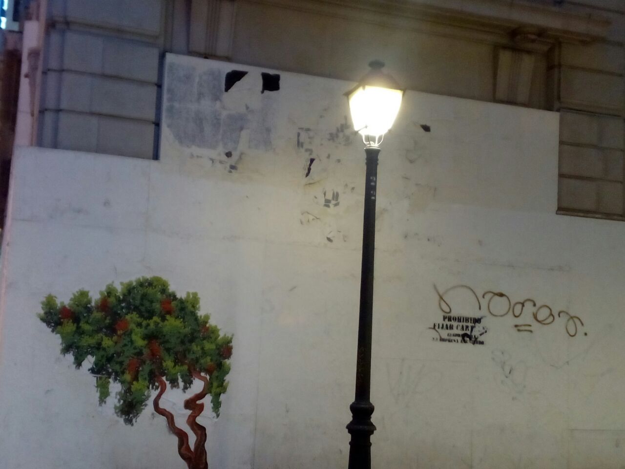 Andaba paseando por la ciudad…¿qué importa la ciudad? Vamos a preocuparnos de las cosas vitales y, desde luego, saber porque ciudad caminaba sin rumbo y perplejo, no importa nada. Bien, paseando por una ciudad sin identificar, me encontré con una aparición, una estampa, que me llenó de interés e intriga. Ante mí: un muro global. Los graffiteros están evolucionando. El muro lo contenía casi todo o todo: un letrero de prohibición en representación de la civilización, una farola encendida en representación de la ciencia, un árbol o arbusto en representación de la naturaleza y un fondo blanco en representación del espíritu. Me acurruqué sobre el muro un rato, unas horas, para meditar sobre su aparición y significado en mi vida. Me acabé una bolsa de pipas y di buena cuenta de una botella de ron. El resto ya es historia…tomé el metro y me dirigí a mi centro de trabajo.