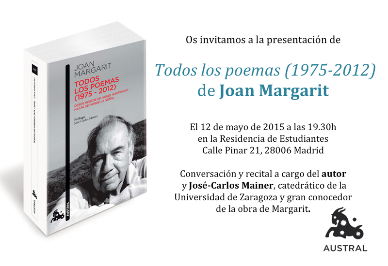 El próximo día doce de mayo (martes) a las 19,30 horas de la tarde tenemos cita de letras poéticas, de las buenas, dado que el poeta Joan Margarit visita la Residencia de Estudiantes, punto de encuentro para presenciar la presentación del libro «Todos los poemas (1975-2012) de Joan Margarit». Dentro de los actos de dicha presentación tendrá lugar una conversación y recital a cargo del propio autor y de José Carlos Mainer, gran conocedor de la obra del artista. Joan Margarit es poeta, arquitecto y catedrático español «jubilado» de la Universidad Politécnica de Cataluña en la Escuela Técnica Superior de Arquitectura de Barcelona. Entre sus galardones destacamos: el Premio Nacional de Poesía por Casa de Misericordia y el Premio Nacional de Literatura de la Generalidad de Cataluña. Apuntar en la agenda.