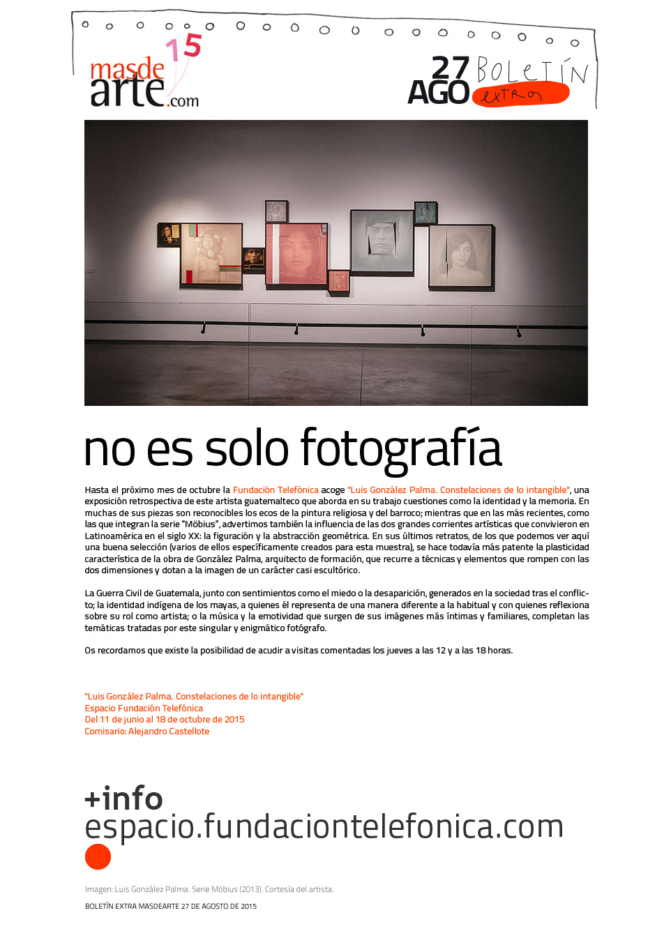 Hasta el próximo mes de octubre tenemos la oportunidad de contemplar en la Fundación Telefónica de Madrid, la exposición: Luis González Palma- Constelaciones de lo Intangible. Se trata de un sugerente trabajo sobre la Identidad y la Memoria, que este artista guatemalteco ha investigado y materializado para la presente exposición. La muestra no es solo fotografía, dado que en su obra podemos contemplar distintas sugerencias y ecos de asuntos religiosos, pintura barroca y abstracción geométrica entre otras influencias, sin olvidar que su origen hace acto de presencia en cada centímetro fotográfico.