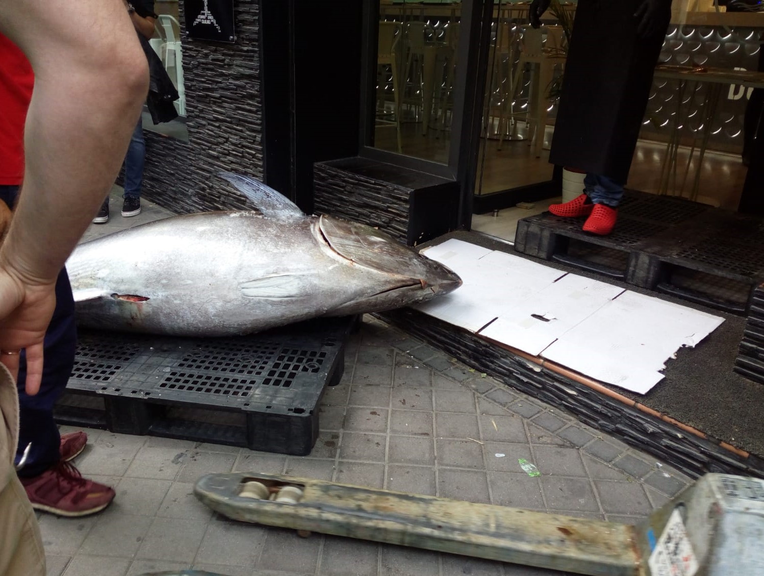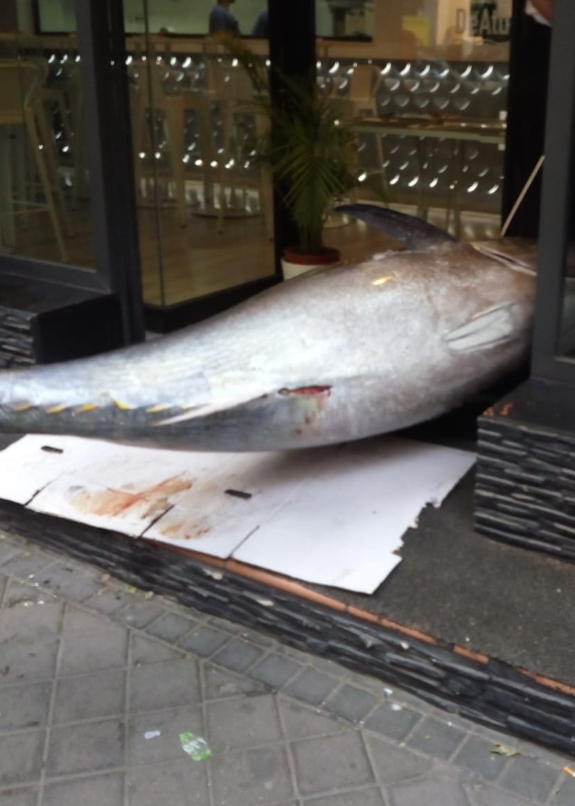 En ocasiones la suerte juega su papel y cuando vas paseando, tranquilamente, por una acera te encuentras un tumulto, piensas en todo menos en lo que vas a encontrar. Luego miras y ves que el tumulto se forma alrededor de un local especializado en viandas varias de atún, te acercas y ahí anda una auténtica joya de los mares, el más rápido de los océanos y tu con la suerte de poder inmortalizar su entrada en el establecimiento antes de que lo conviertan en suculentos platos (Fotos: Tuchy Regueras)
