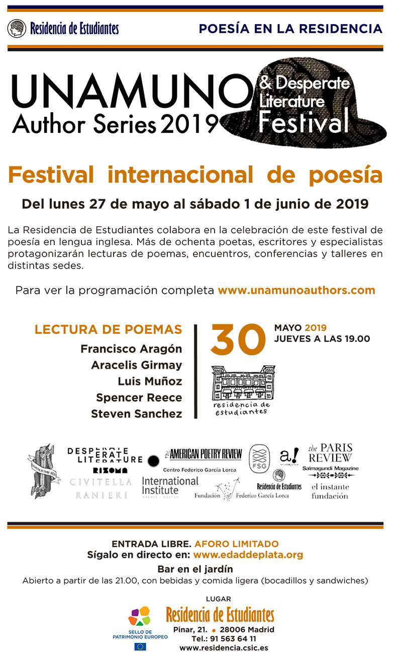 Hasta el próximo uno de junio la Residencia de Estudiantes propone un Festival Internacional de poesía, organizado por Unamuno Authors. Para mayor información consultar el siguiente enlace