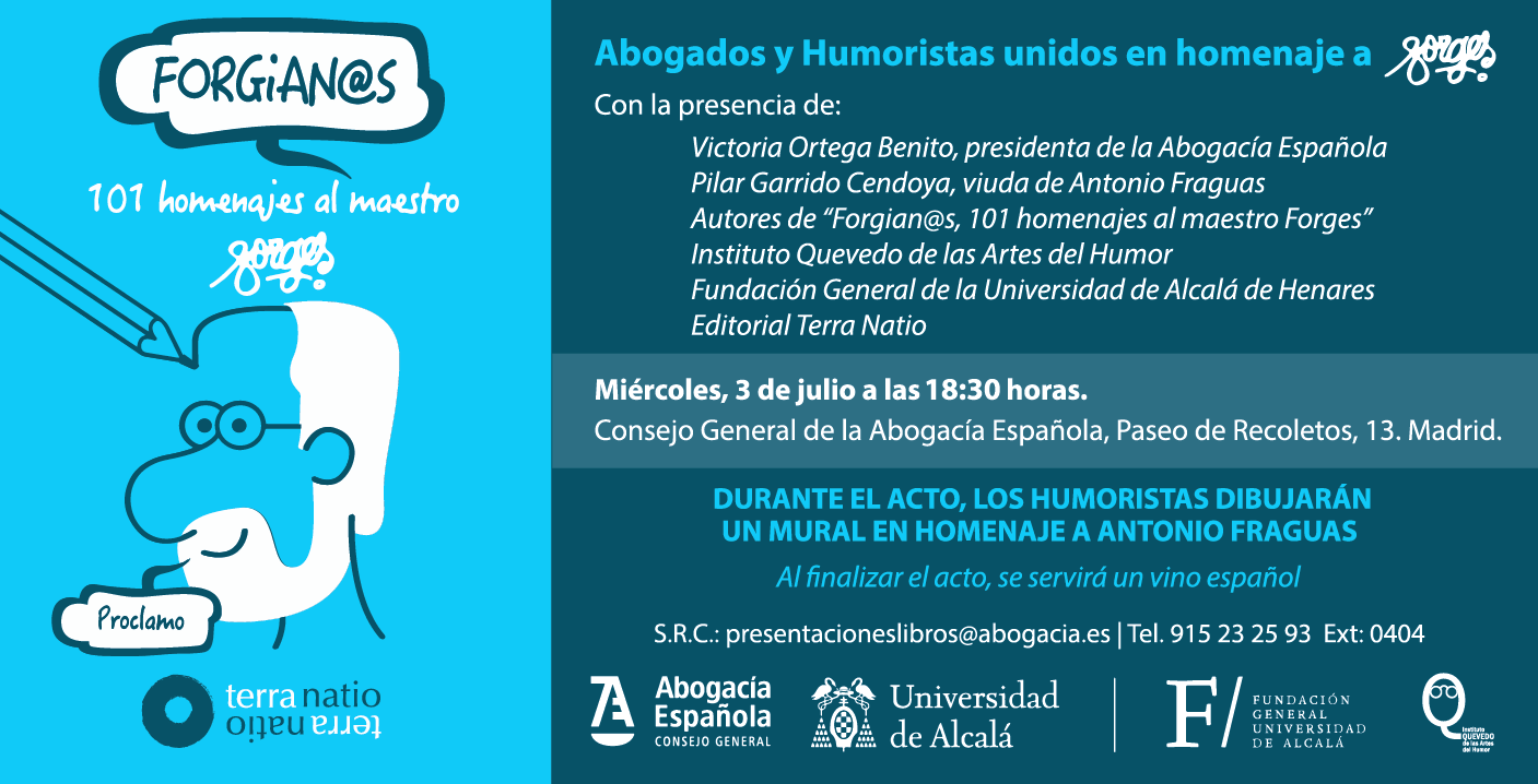 El miércoles 3 de julio tenemos presentación del libro «Forgian@s 101 homenajes al maestro Forges, en la sede de la Abogacía Española. Abogados y humoristas homenajean a Forges y estos últimos llevarán a cabo un mural dedicado al singular artista, defensor de la tolerancia y la libertad, bajo su verbo comunicativo y generoso en el humor.