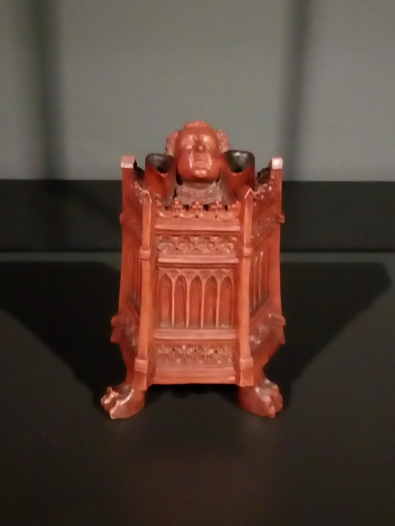 Enigmática pieza realizada en boj allá entre 1380-1400. Se trata de un tintero con un monje en un púlpito. Su origen y uso permite muchas especulaciones, entre ellas, que este tintero perteneciera a los Carthuslans, que dado su voto de silencio no podían seguir la palabra pero sí escribirla o leerla. No está en mi mano matizar más, pero la apuntada me parece todo un romanticismo perdido en los tiempos.