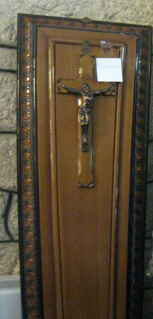 Tapa de ataúd ya reservada y con dueño. Hay nota aclaratoria con el nombre del finado para evitar confusiones. Estamos en una pequeña parroquia, extramuros de las convenciones, próxima a nuestras raíces más hondas. En la misa hay lleno y acompañan la liturgia un par de féretros. Fuera hay feria de quesos y pequeña romería. Antropología pura.