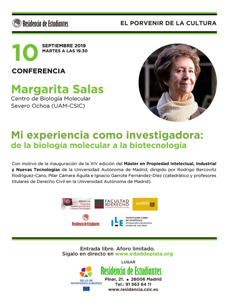 Se retoman los ciclos de actividades en la Residencia de Estudiantes y para abrir boca, el próximo 10 de septiembre tendremos la oportunidad de asistir a una conferencia de Margarita Salas del Centro de Biología Molecular Severo Ochoa (UAM-CSIC), titulada «Mi experiencia como investigadora». Buen inicio de curso.