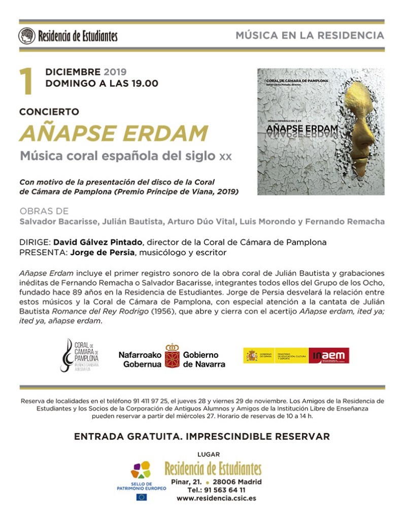 El domingo uno de diciembre podemos asistir al concierto: «Añapse Erdam», música coral española del siglo XX, con motivo de la presentación del disco de la Coral de Cámara de Pamplona (Premio Príncioe de Viana, 2019)