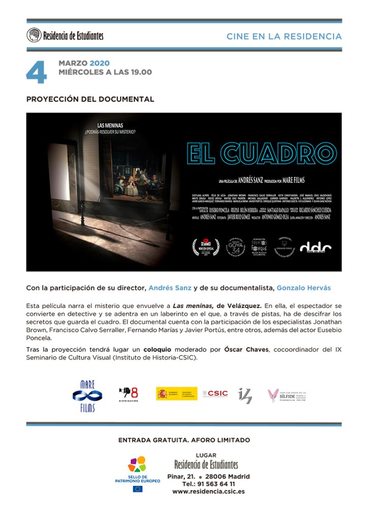El Cuadro es un documental dirigido por Andrés Sanz que narra el misterio que envuelve a Las Meninas de Velázquez. El director, junto a su documentalista, Gonzalo Hervás, propone al espectador algo parecido a un seguimiento detectivesco, para dar luz al laberinto mágico de esta gran pieza. Adjuntamos programa del evento para mayor y mejor información.