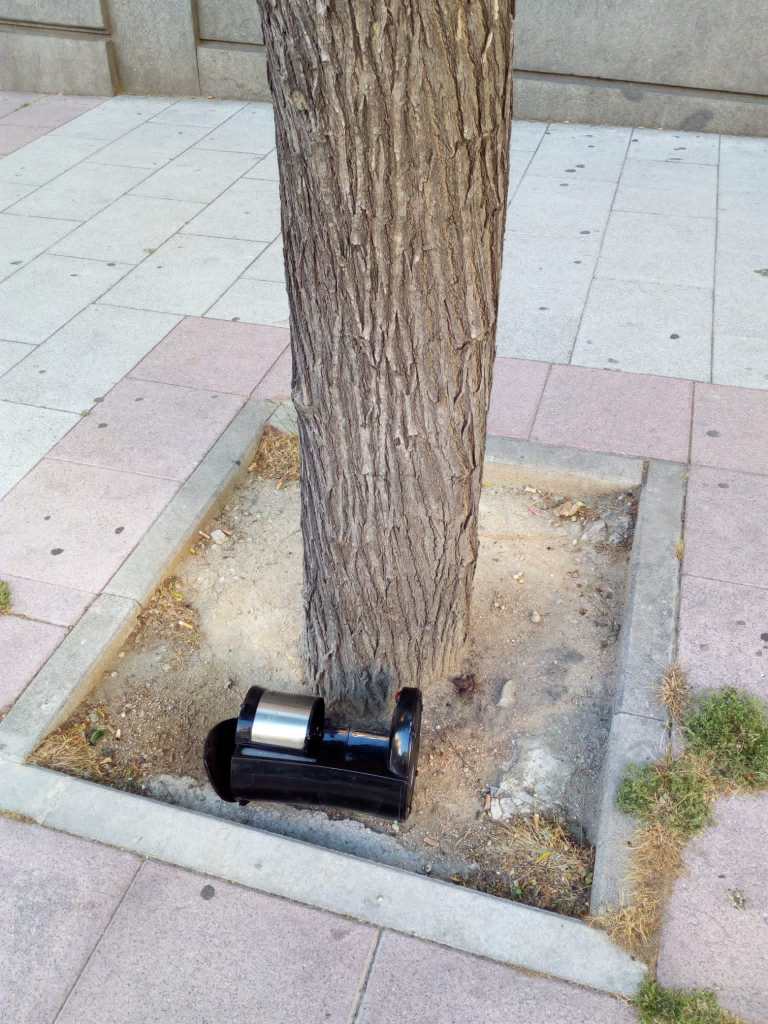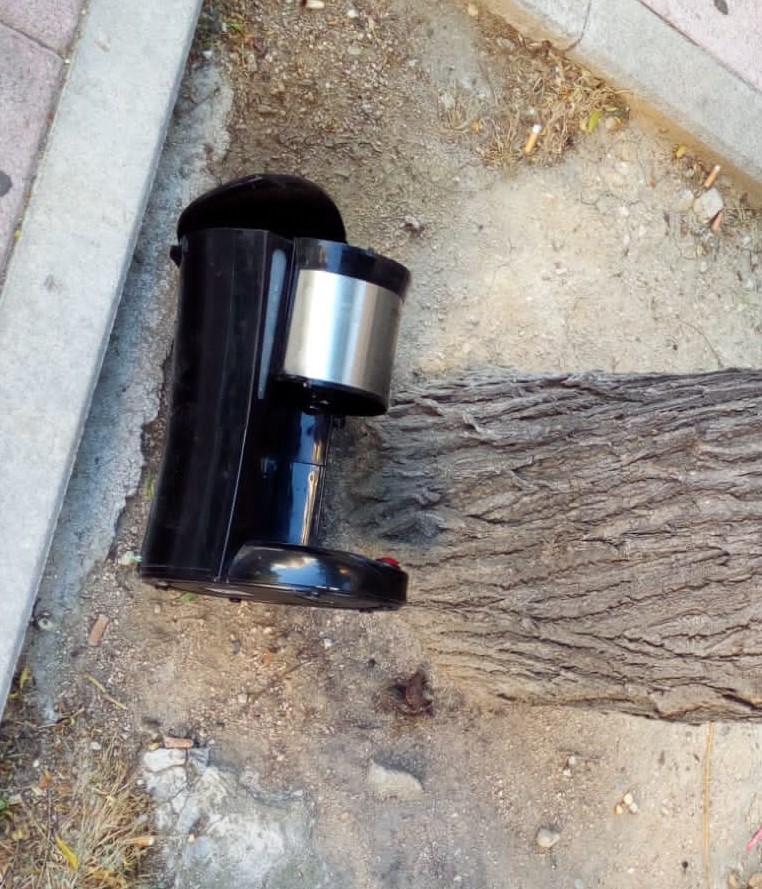 La cafetera aún estaba templada y medio llena. Supongo que un sin techo, un bohemio transgresor, un buscador de nuevas aventuras o un ahorrador radical, estarán satisfechos del regalo que custodia el alcorque. Igual esperarán alrededor del café un poco de charla y relax. Mi lado oscuro apuesta por localizar al descerebrado que envenena la estética natural y hace crecer la basura urbana sin pensar en sus consecuencias.