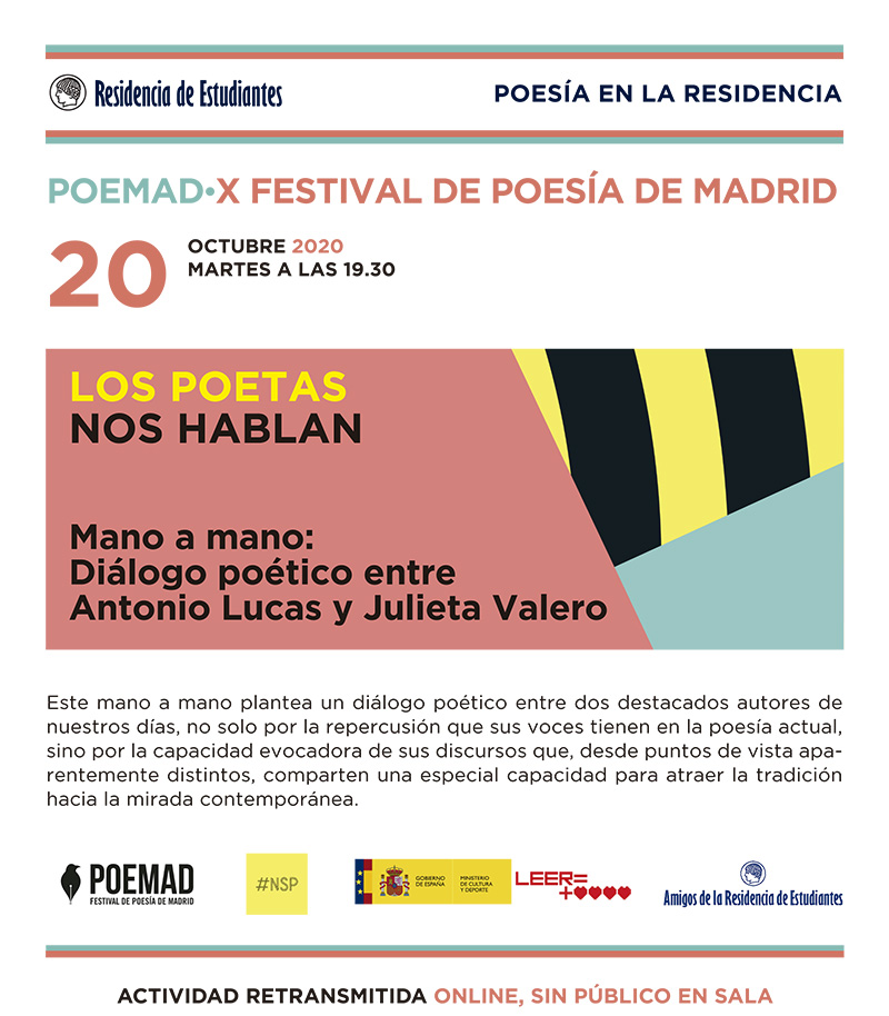 Llueve, cierto, caen versos desde el cielo, amunciando que tenemos tiempo para reconstruir la tarde y acercarnos a Poemad, el X Festival de Poesía de Madrid. Podremos tener acceso al diálogo poético de Antonio Lucas y Julieta Valero. Todo ello esta tarde en la Residencia de Estudiantes a las 19,30 horas.