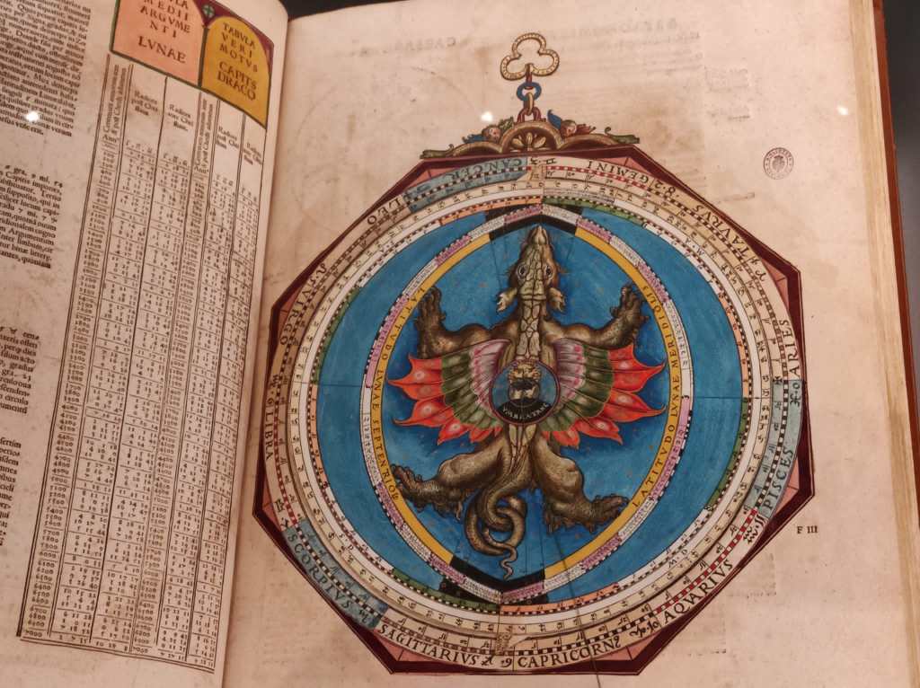Hasta el próximo mes de enero tendremos ocasión de contemplar una de las grandes joyas pertenecientes a los fondos de la Biblioteca Nocional. Hablamos del “Astronomicum Caesareum”, obra de Petrus Apianus (1540), considerada no solo pieza maestra de la imprenta, también una significativa obra de arte. Especial relevancia tienen sus ilustraciones astronómicas, las más importantes de la historia hasta la publicación de la obra de Copérnico. Sin olvidar el resumen que expone en sus páginas sobre el conocimiento de la astronomía y los instrumentos astronómicos. La obra está dedicada a Carlos V y es considerada como el libro de imprenta más espectacular del siglo XVI. Auténtica poesía transmitida a través del tiempo y la imprenta. (Fotografías de Tuchy Regueras)