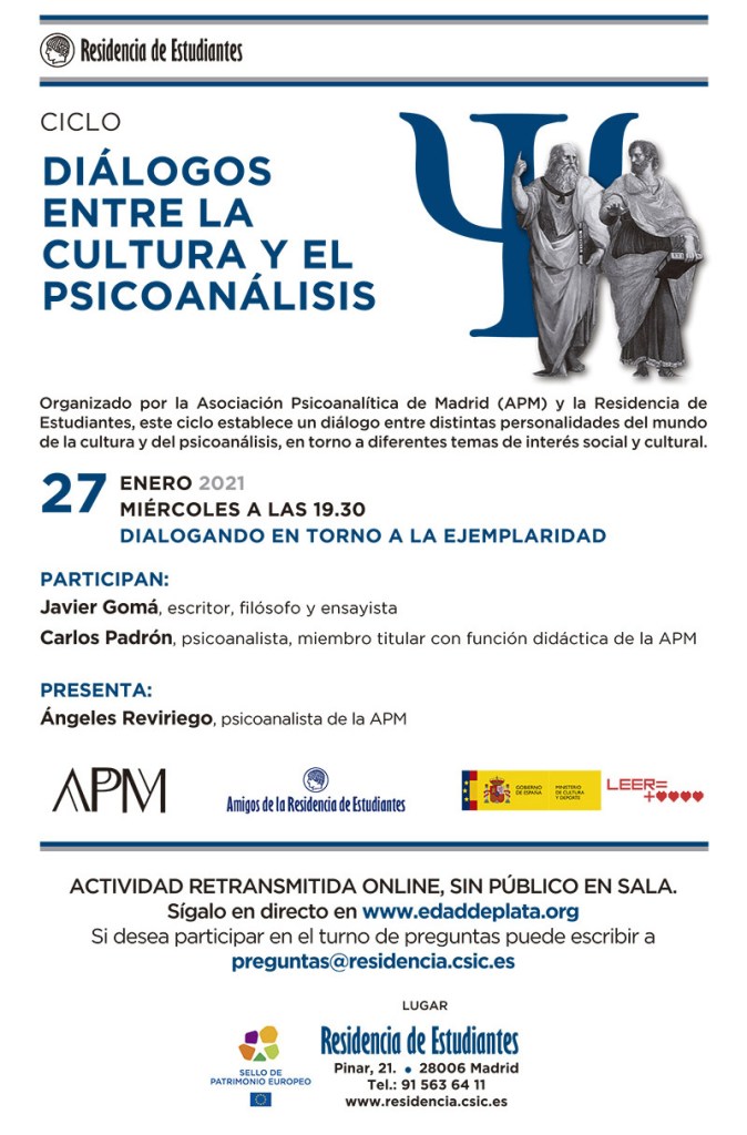 Dadas las circunstancias, la actividad cultural en las redes sigue sumando iniciativas. En esta ocasión, la Residencia de Estudiantes y la Asociación Psicoanalítica de Madrid, presentan: Diálogos entre la Cultura y el Psicoanálisis. Actividad retransmitida on line y prevista para el próximo día 27 de enero a las 19, 30 horas. Para mayor precisión informativa consultar el programa adjunto.