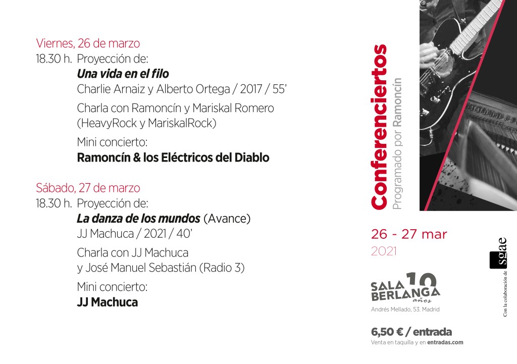 Nos hacemos eco de la programación en la Sala Berlanga de Madrid para los próximos 26 y 27 de marzo. La actividad propuesta se compone de proyecciones, charla y mini concierto y estarán a cargo de Ramoncín &los Eléctricos del Diablo, J.J. Machuca y José Manuel Sebastián. Para mayor información consultar el programa adjunto.