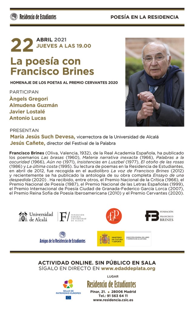 Publicado el abril 21, 2021 en AGENDA CULTURAL y etiquetado en Francisco Brines, Premio Cervantes 2020, Residencia Estdiantes. Guarda el enlace permanente. Deja un comentario.