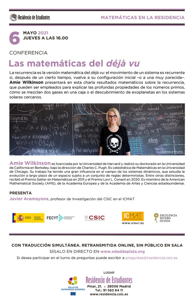 Publicado el mayo 3, 2021 en AGENDA CULTURAL y etiquetado en Amie Wilkinson, Matemáticas del déjà vu, Poesía y matemática. Guarda el enlace permanente. Deja un comentario.