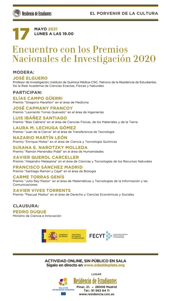 Dentro del ciclo «El porvenir de la cultura» , la Residencia de Estudiantes nos cita el próximo 17 de mayo al «Encuentro con los Premios Nacionales de Investigación 2020» que moderará José Elguero y clausurará Pedro Duque. Para mayor información y detalles sugerimos atender el programa adjunto.