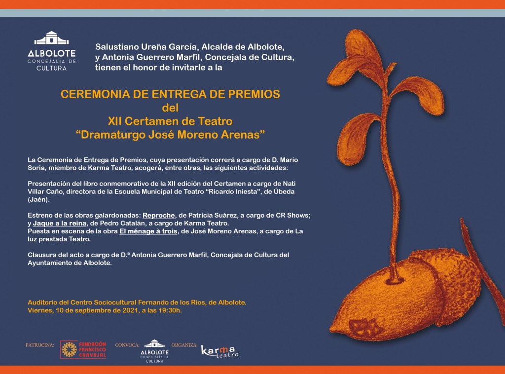 Esta tarde tendrá lugar la Ceremonia de entrega de Premios del XII Certamen de Teatro «Dramaturgo José Moreno Arenas. El punto de encuentro tendrá lugar en el Auditorio del Centro Sociocultural Fernando de los Ríos de Albolote. El evento se iniciará a las 19,30 horas. Los premiados en esta ocasión son: Patricia Suárez y Pedro Catalán. Para mayor información y detalle se sugiere consultar el programa adjunto.
