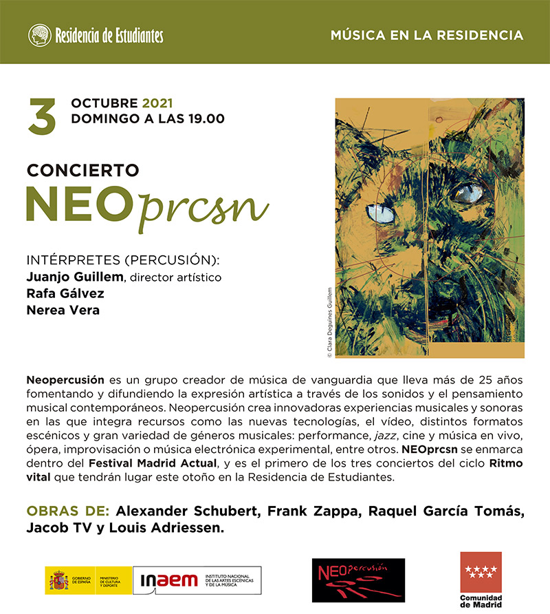 Mañana domingo tres de octubre, música en la Residencia de Estudiantes de Madrid. Se presenta el Concierto NEOprcsn. Innovación , sugerencias y planteamientos musicales atrevidos mediante la percusión. Para mayor información y detalle consultar el programa adjunto.