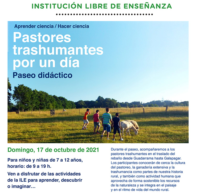 La Institución Libre de Enseñanza propone un paseo didáctico y convertirse por veinticuatro horas en pastor trashumante y conducir un rebaño desde Guadarrama a Galapagar. âra mayor información y detalle consultar el programa adjunto.