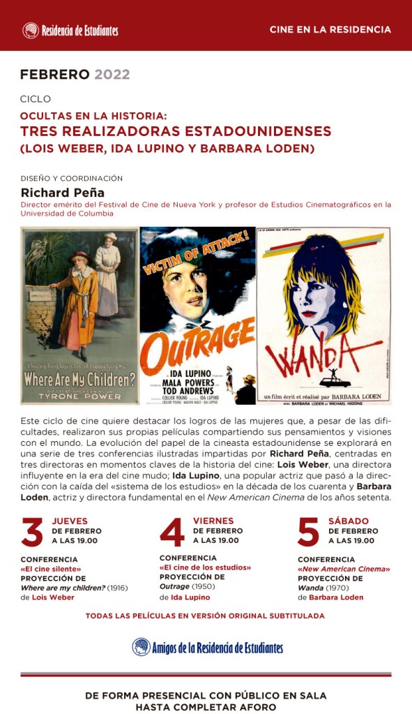 Conferencias y proyecciones dedicadas a tres realizadoras estadounidenses: Lois Weber, Ida Lupino y Barbara Loden. La cita cultural tendrá lugar el próximo mes de febrero dentro de las actividades de «Cine en la Residencia». El diseño y coordinación corre a cargo de Richard Peña. Para mayor información y detalle consultar el programa adjunto.