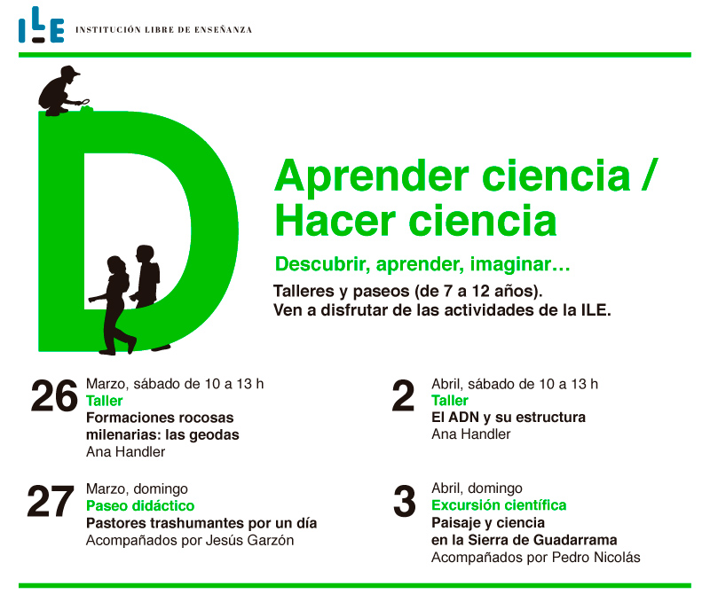 La Institución de Libre Enseñanza de Madrid propone acercarse a la ciencia en edades tempranas, en la primavera de nuestras vidas. Cuando podemos descubrir, aprender, imaginar y soñar empieza pronto, muy pronto a llamar a la puerta de nuestro conocimiento y curiosidad. La Institución de Libre Enseñanza ofrece Talleres, Paseos Didácticos y Excursiones científicas. Una buena oportunidad para acercar a los más pequeños al universo de la ciencia. Para mayor información y detalle consultar programa adjunto, sin olvidar la web: https://www.fundacionginer.org/