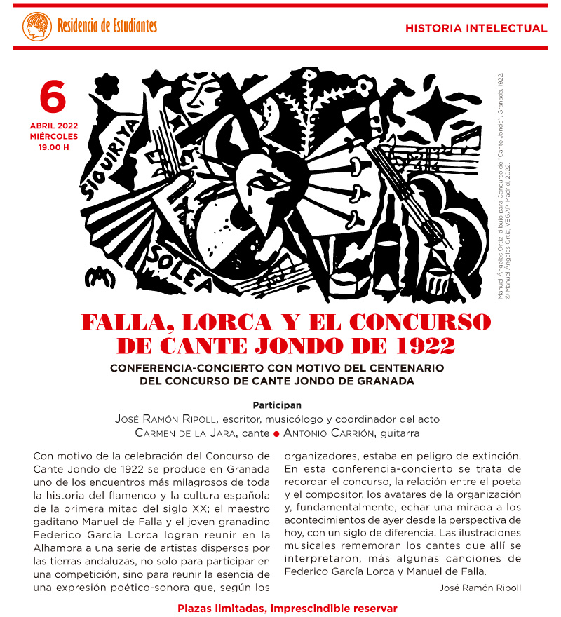 Se cumple el centenario de un evento cultural e histórico que reunió en 1922 dos nombres propios: Falla y Lorca. Consiguieron reunir un elenco jondo disperso para convertir la Alhambra en base de un encuentro que ha congregado respeto y admiración a través del tiempo. El próximo día seis, José Ramón Ripoll, coordinador de la cita, nos trasladará a la esencia de esos tiempos que germinaron continuidad artística en nuestras páginas culturales más actuales. Para mayor información y detalle consultar programa adjunto.