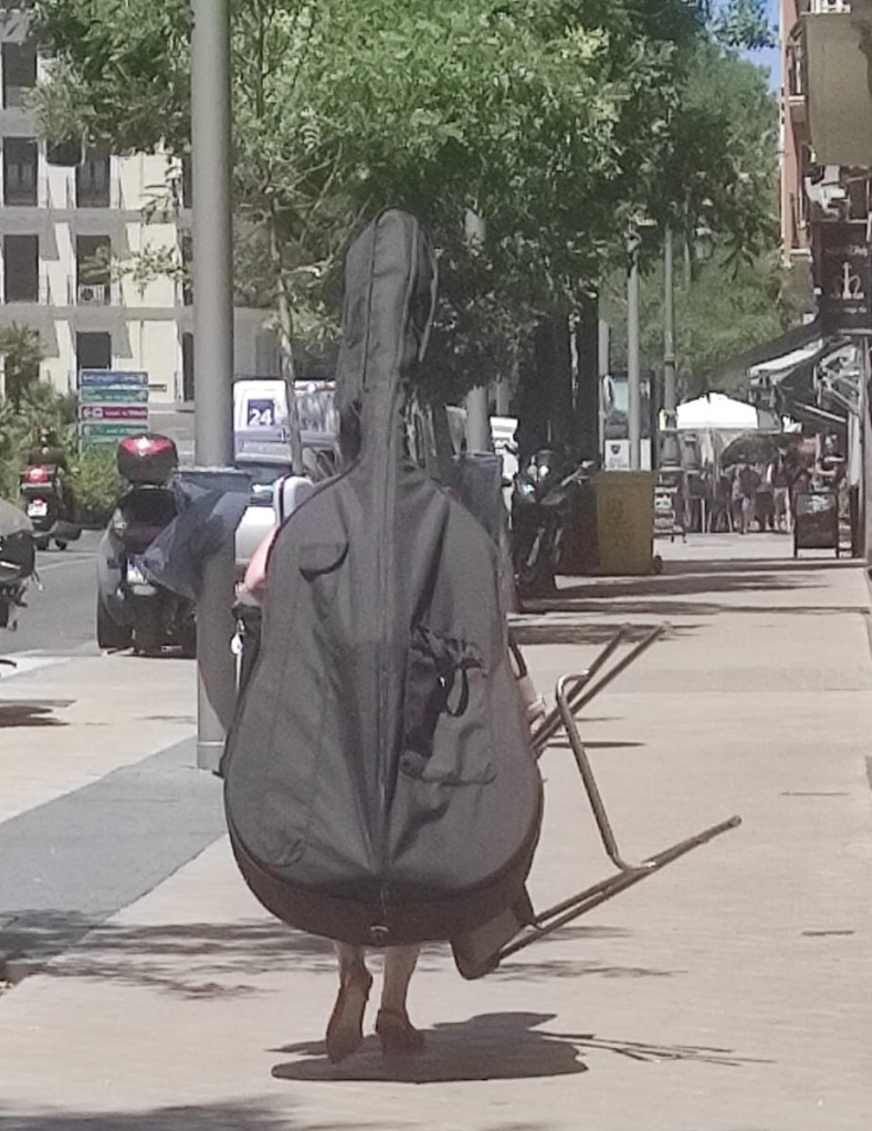 Me lo crucé en la calle y decidí seguirlo para no perderme su próximo concierto. Un contrabajo y una silla no son mascotas para sacarlas a pasear. Estaba claro que el peregrinaje callejero tenía finalidad musical. Tenía la esperanza de que en cualquier momento me regalara unas notas. No lo hizo, pero se donde vive, mañana le seguiré de nuevo