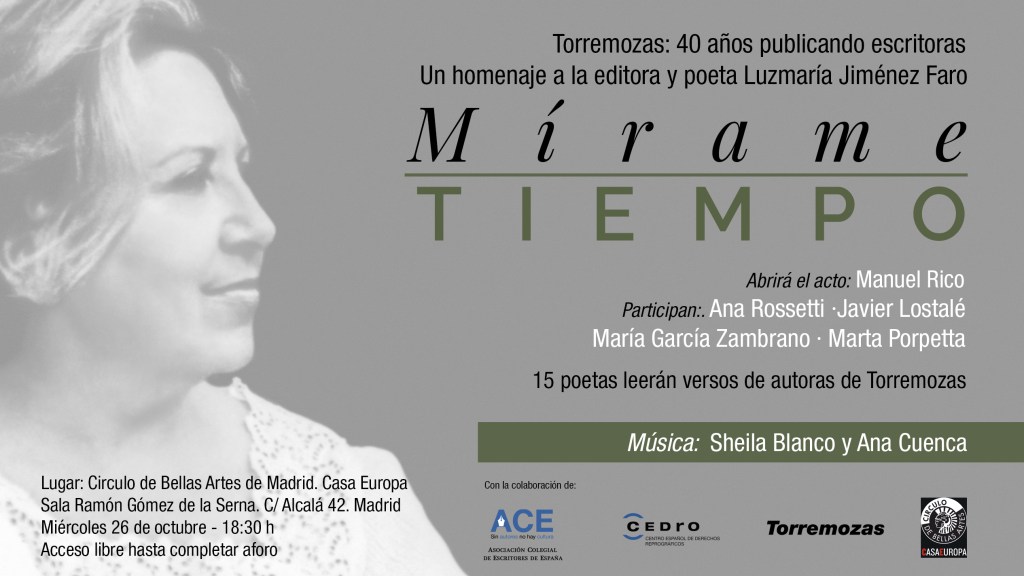 El próximo 26 de octubre, a las 18,30 horas, en la Sala Ramón Gómez de la Serna del Círculo de Bellas Artes, tendrá lugar un encuentro-homenaje dentro del mes de las escritoras. Esta parcela cultural rendirá reconocimiento a los 40 años de ediciones Torremozas y a su fundadora, Luzmaria Jimenez Faro. La entrada será libre hasta completar aforo.