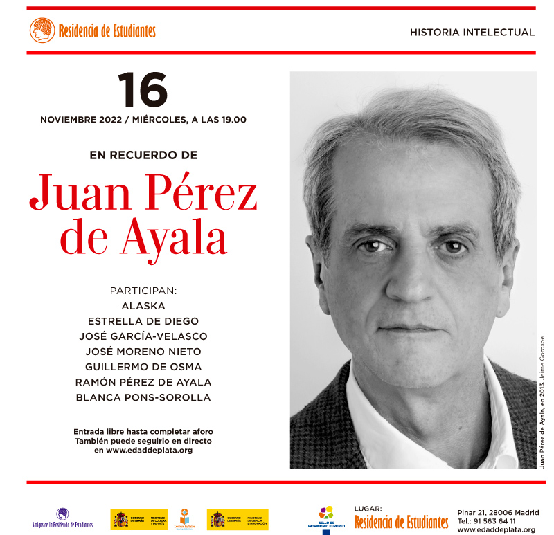 Hoy, 16 de noviembre a las 19 horas, tendrá un acto de recuerdo del historiador, crítico de arte y comisario de exposiciones, entre otras muchas actividades, Juan Pérez de Ayala. El evento tendrá lugar en la Residencia de Estudiantes de Madrid. Estarán presentes: Alaska, Estrella de Diego y Guillermo de Osma, entre otros participantes. Para mayor información y detalle consultar el programa adjunto.