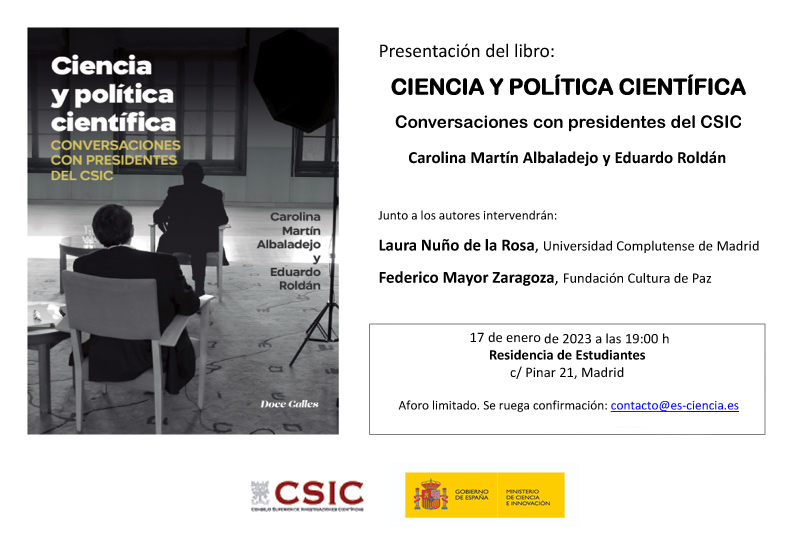 Presentación del libro: Ciencia y Política Científica, Conversaciones con presidentes del CSIC que tendrá lugar el 17 de enero en la Residencia de Estudiantes de Madrid. Junto a los autores Carolina Martín Albadalejo y Eduardo Roldán, intervendrán Laura Nuño y Federico Mayor Zaragoza. Para más información y detalle sobre el evento consultar programa adjunto.
