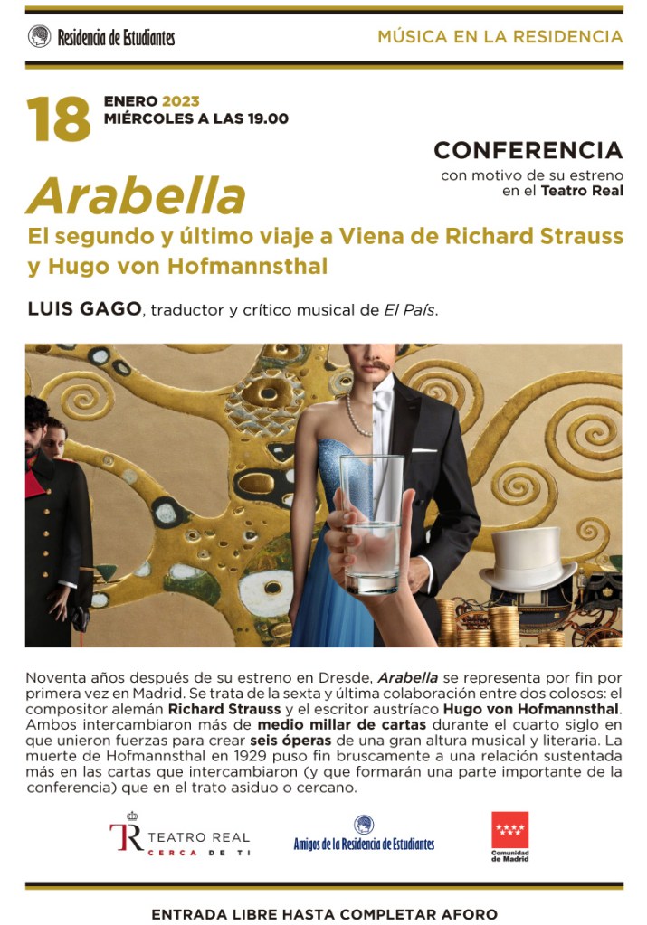 Arabella, el segundo y último viaje a Viena de Richard Strauss y Hugo von Hofmannsthal. Con motivo del estreno de Arabella en el Teatro Real, tenemos una cita sugerente, la conferencia sobre la obra para una mayor comprensión y acercamiento, a cargo del traductor y crítico musical: Luis Gago. Para mayor información y detalle consultar el programa adjunto.