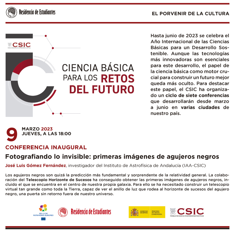 El próximo nueve de marzo quedará abierto dentro del ciclo; El Porvenir de la Cultura, el programa del CSIC: Ciencia Básica para los Retos del futuro. La primera conferencia versará sobre el tema: Fotografiando lo invisible: primeras imágenes de agujeros negros. Para mayor información y detalle consultar el programa adjunto.