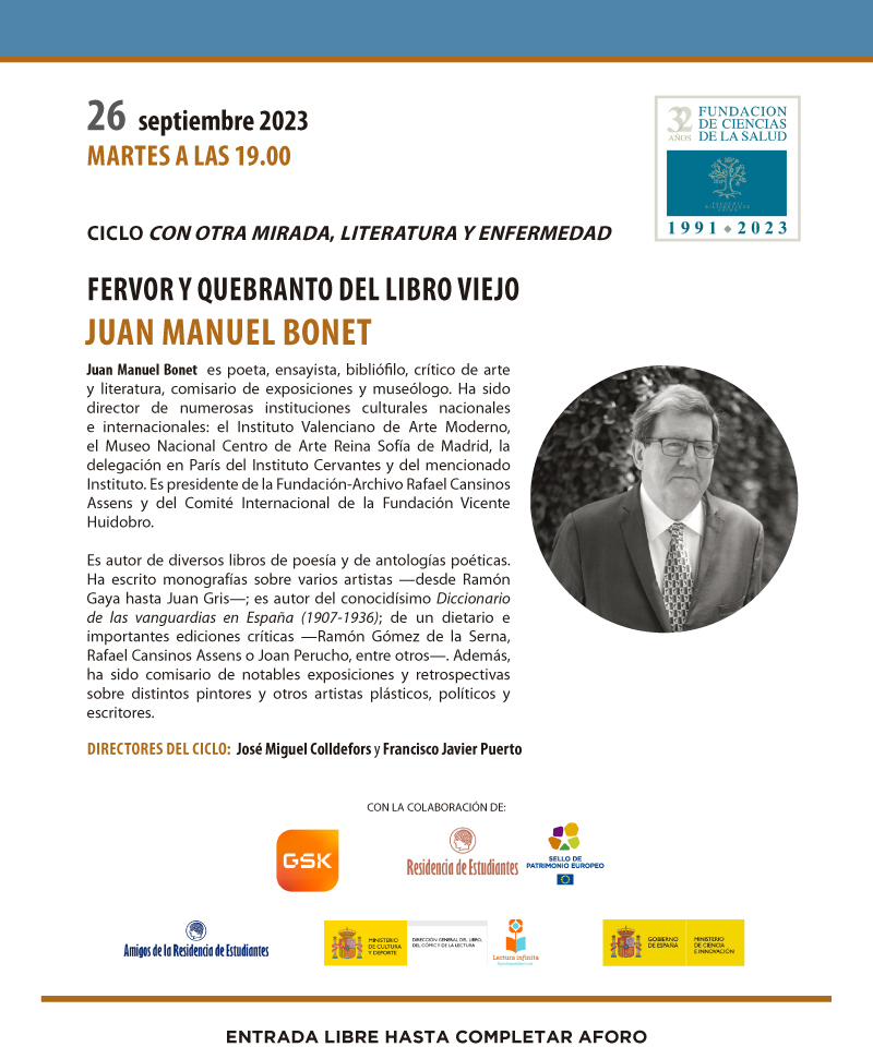 El próximo martes día 26 de septiembre dentro del Ciclo con otra mirada, literatura y enfermedad, en la sede de la Residencia de Estudiantes, tendremos ocasión de seguir a Juan Manuel Bonet en su presentación sobre el Fervor y Quebranto del libro viejo. Para mayor información consultar el programa adjunto.