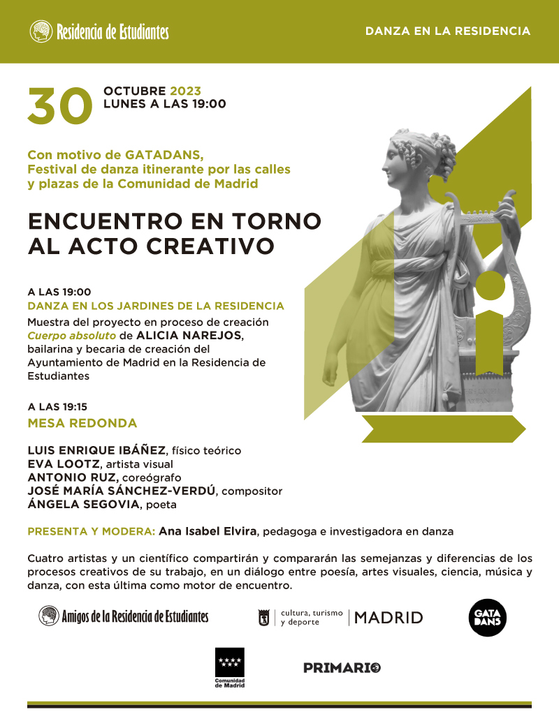 Con motivo de Gatadans, Festival de danza itinerante por las calles y plazas de la Comunidad de Madrid, el próximo 30 de octubre se celebrará en la Residencia de Estudiantes de Madrid. el «Encuentro en torno al Acto Creativo». Para mayor información y detalle consultar programa adjunto.