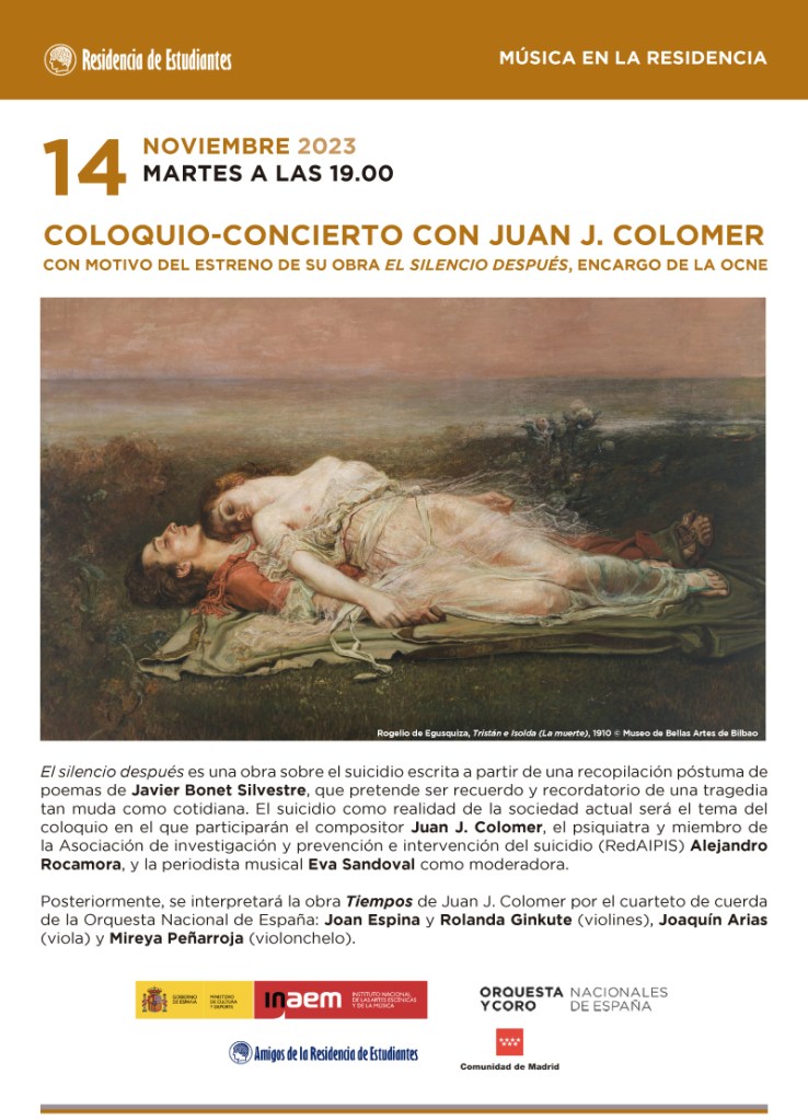 En el hipotético caso de que no tenga cerrada la agenda cultural para esta tarde, recomendamos el Coloquio-Concierto con Juan J. Colomer, con motivo del estreno de su obra «El silencio después» encargo de la OCNE. Para mayor información y detalles consultar el programa adjunto.