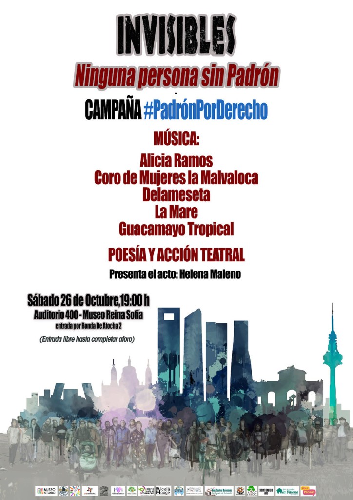 «Invisibles: Ninguna persona sin Padrón». Helena Maleno presentará mañana sábado en el Auditorio 400 del Museo Reina Sofía la Campaña: PadrónPorDerecho. Para mayor información y detalle, sobre la Poesía y Acción Teatral que acompañarán el evento, consultar el programa adjunto.