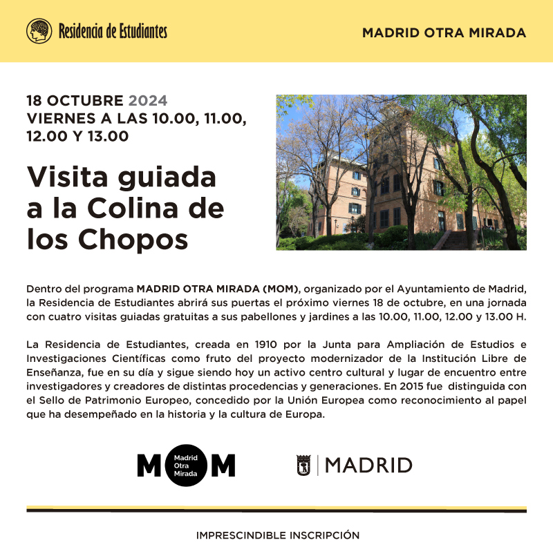 Dentro del programa «Madrid otra mirada» , la Residencia de Estudiantes ofrecerá visitas guiadas a sus Jardines y Pabellones, el próximo 18 de octubre. Una forma de acercarnos a la historia de esta Institución que sigue apostando por la cultura y el conocimiento. Para mayor información y detalle consultar el programa adjunto.