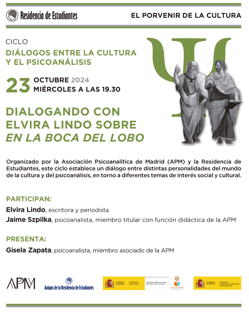 Dentro del ciclo «Diálogos entre la cultura y el psicoanálisis» el día 23 de octubre podremos asistir a «Dialogando con Elvira Lindo sobre en la boca del lobo». Para mayor información y detalle consultar el programa adjunto.