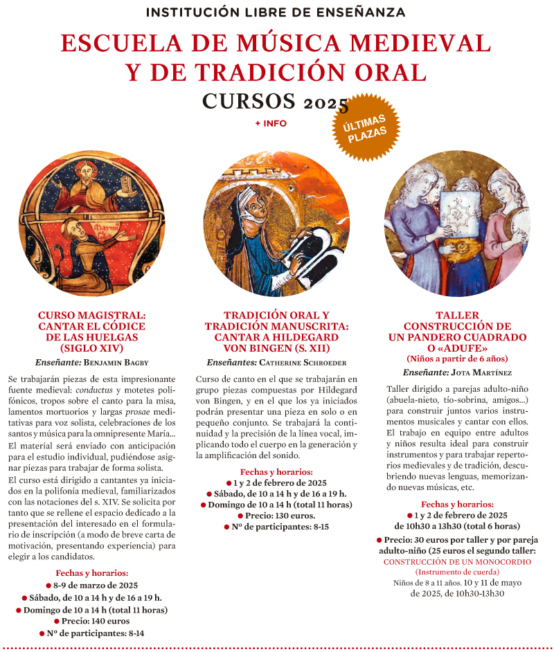 Nos hacemos eco de los cursos de la Escuela de Música Medieval y de Tradición Oral que pueden seguirse en la Institución Libre de Enseñanza. Una parcela musical que debería conocerse más y mejor, que nos sumerge en el tiempo. Para mayor información y detalle consultar el programa adjunto.