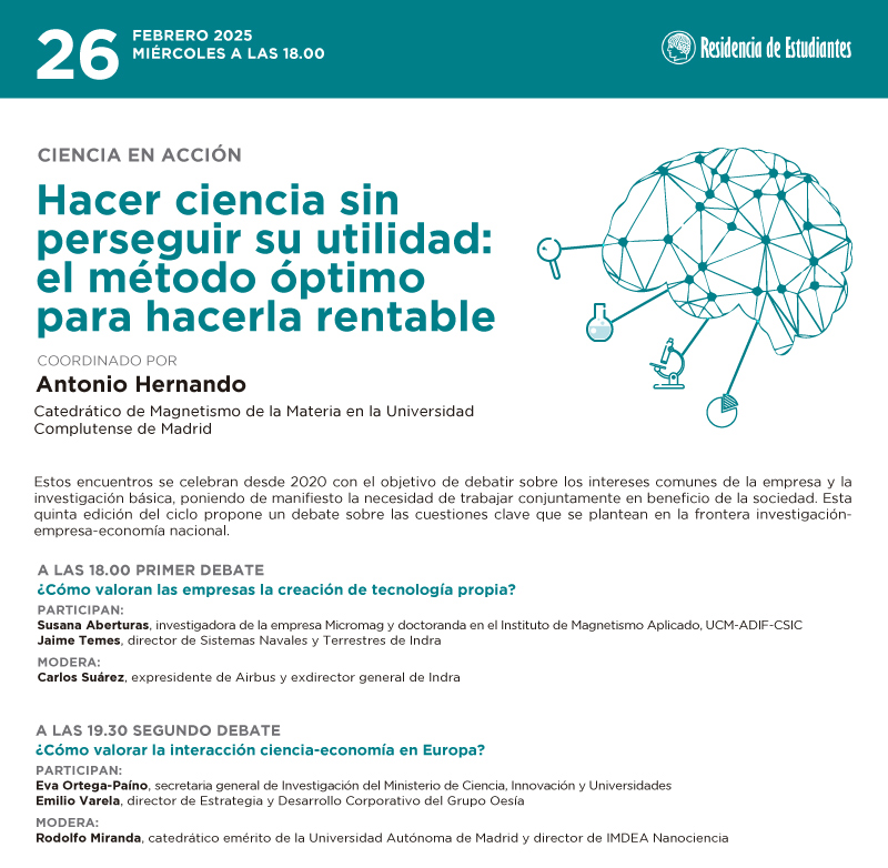 El próximo día 26 de febrero tendremos ocasión de asistir en la Residencia de Estudiantes a dos debates sobre la ciencia, todo ello, coordinado por D. Antonio Hernando, Catedrático de Magnetismo de la Materia en la Universidad Complutense de Madrid. Para mayor información y detalle consultar el programa adjunto.
