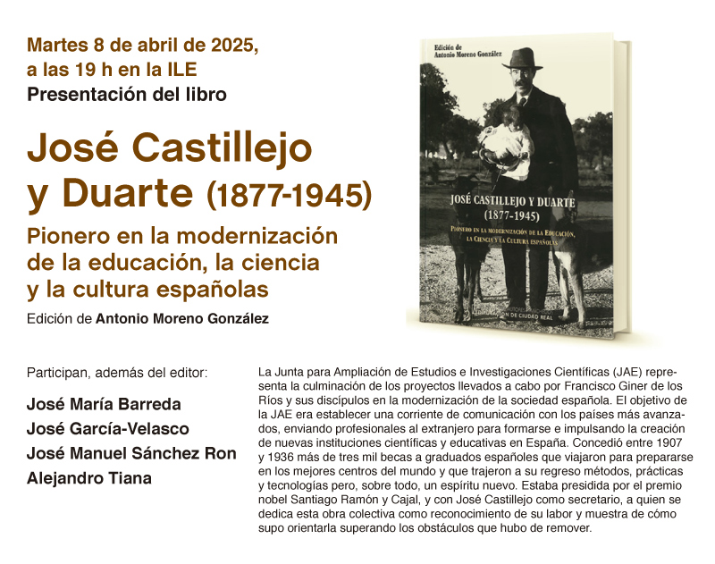El próximo martes 8 de abril en la Institución Libre de Enseñanza tendremos ocasión de seguir la Presentación del Libro : José Castillejo y Duarte (1877-1945), Pionero en la modernización de la educación, la ciencia y la cultura española. La edición corre a cargo de Antonio Moreno González. Para mayor información y detalle consultar el programa adjunto.