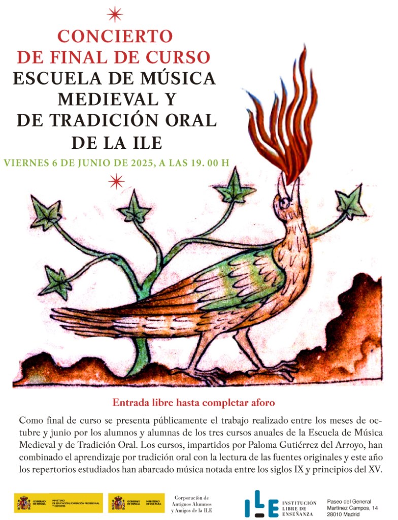 Todo final de curso debe celebrarse y los cursos que imparte Paloma Gutiérrez del Arroyo sobre música medieval y de tradición oral, no podían ser diferentes. Puede acudir todo el mundo al concierto hasta completar aforo. Una oportunidad muy atractiva para acercarse a un universo musical que contiene sugerencias y creatividad a manos llenas. Para mayor información y detalle consultar el programa adjunto.
