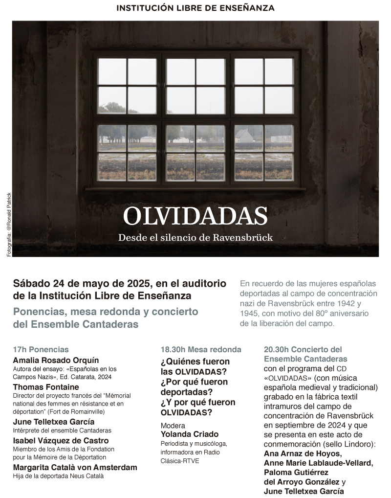 La Institución Libre de Enseñanza, nos propone en su auditorio un recuerdo de las mujeres españolas deportadas al campo de concentración de Ravensbrück entre 1942-1945. Ponencias, mesa redonda y concierto del Ensemble Cantaderas, nos acercarán a unos hechos no lo suficientemente conocidos de nuestra historia reciente.