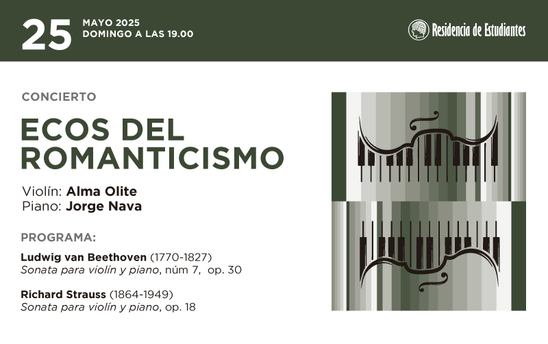 El domingo 25 de mayo la Residencia de Estudiantes nos ofrece el concierto: Ecos del Romanticismo con un programa conformado por Beethoven y Richard Strauss. El violín correrá a cargo de Alma Olite y el piano será cosa de Jorge Nava. Un concierto sugerente para acabar la semana y tomar fuerzas musicales a base de dos grandes de nuestra historia artística.