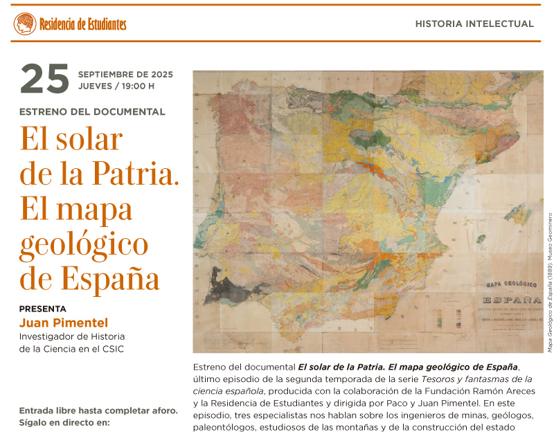 Nos hacemos eco del estreno del documental: El solar de la Patria. El mapa geológico de España. Presenta el evento Juan Pimentel, Investigador de la Historia de la Ciencia en el CSIC. Una singular puesta en escena que nos descubrirá diferentes pormenores de la ciencia geológica y los especialistas que la abordan. Para mayor información y detalle consultar programa adjunto.