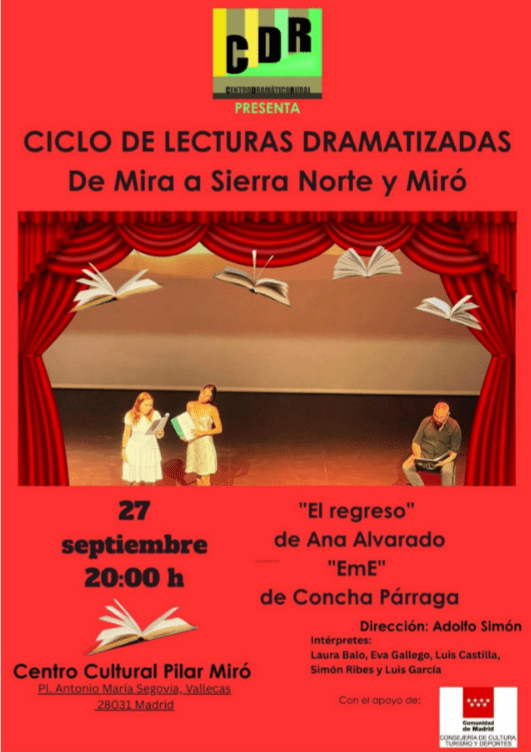 Hoy a las 20 horas podemos asistir a un Ciclo de Lecturas Dramatizadas de Mira a Sierra Norte y Miró. Bajo la dirección de Adolfo Simón se dramatizarán las obras «El regreso» de Ana Alvarado y «EmE» de Concha Párraga. El lugar de la cita es el Centro Cultural Pilar Miró de la Villa de Vallecas.