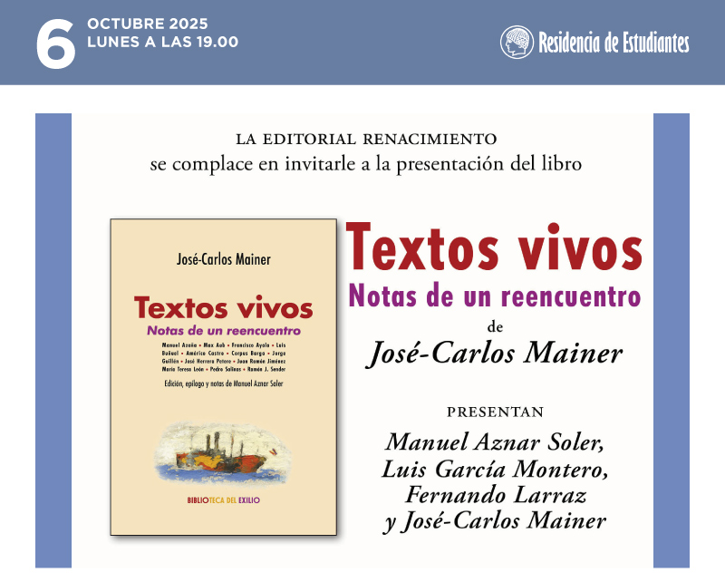 Nos hacemos eco de la presentación de la editorial Renacimiento, en la Residencia de Estudiantes, del libro «Textos Vivos» Notas de un reencuentro de José-Carlos Mainer. Presentarán el evento Manuel Aznar Soler, Luis García Montero, Fernando Larraz y José-Carlos Mainer. Para mayor información y detalle consultar el programa adjunto.