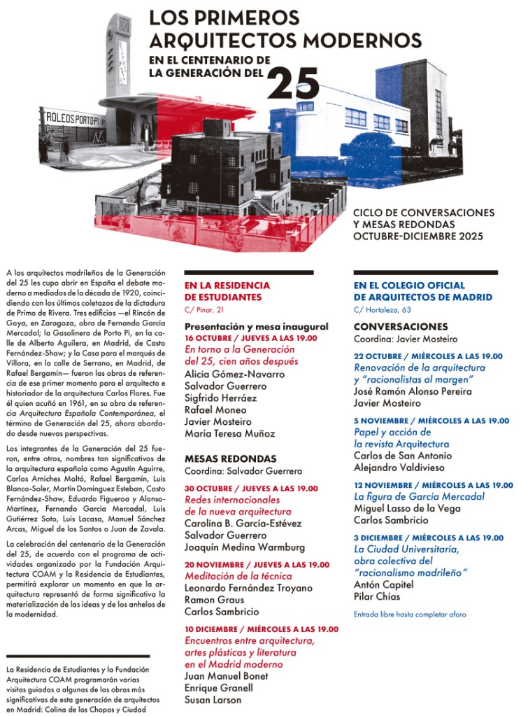 Ciclo de Conversaciones y Mesas Redondas entre octubre y diciembre 2025 en el Centenario de la Generación del 25. Las actividades se desarrollarán tanto en la Residencia de Estudiantes como en el Colegio Oficial de Arquitectos de Madrid. Para mayor información y detalle consultar el programa adjunto.