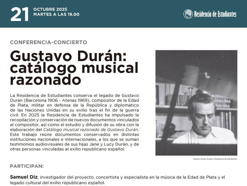 Como continuación al Taller de Poesía «Tinta Invisible» en la Residencia de Estudiantes, el próximo 21 de octubre tendrá lugar la Conferencia-Concierto «Gustavo Durán: catálogo musical razonado». Una hermosa manera de reivindicar la obra y personalidad de este artista al que falta conocer más y en profundidad. Una buena manera de rescatar su obra es esta conferencia-concierto.